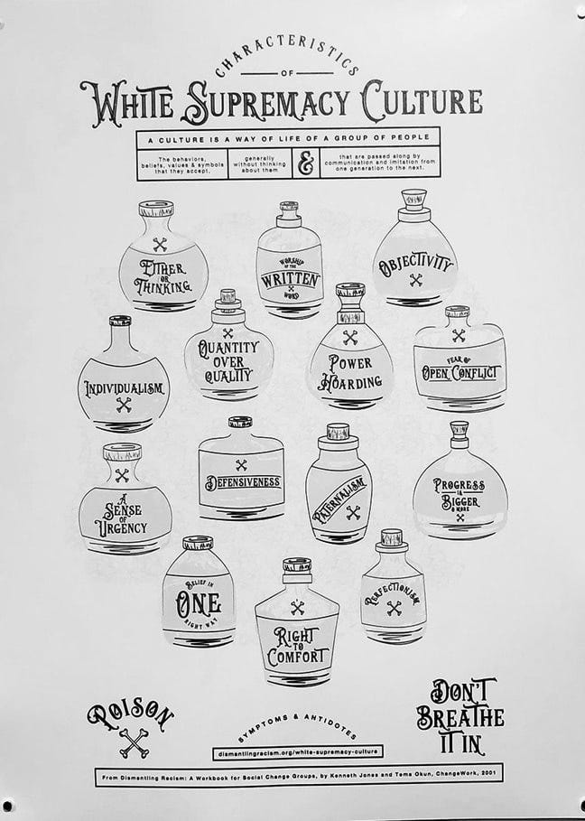 In offering gatherings and relational support to combat an Epidemic of Loneliness, it is important to remember that loneliness is a product of white supremacy culture—not an individual failing. We all steep in individualism, perfectionism, and a right to comfort without the skills to interrupt the harm of isolation and disconnection. Even with knowledge and ability, moving against the current of white supremacy is often difficult and painful and cannot be done alone. The tenets of white supremacy culture were developed by Kenneth Jones and Tema Okun in 2001 and compiled into a free digital resource, Dismantling Racism: A Workbook for Social Change Groups. This is a crucial text for how white supremacy impacts all of our relationships, impairing our ability to safely connect.