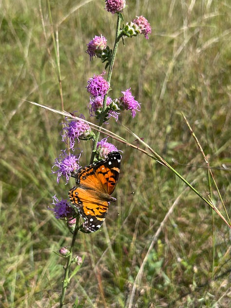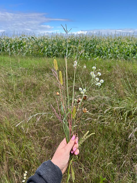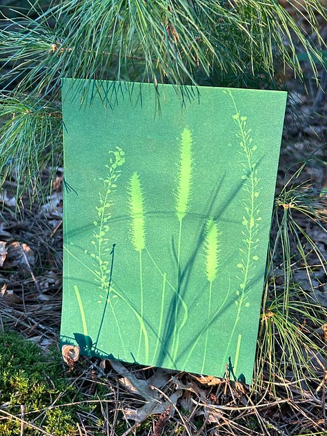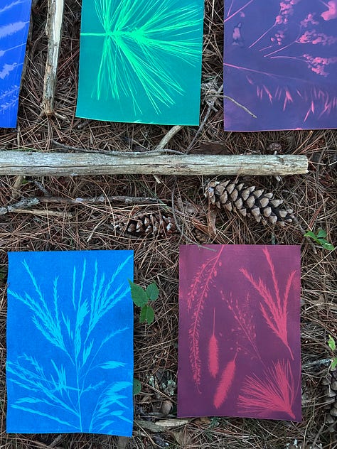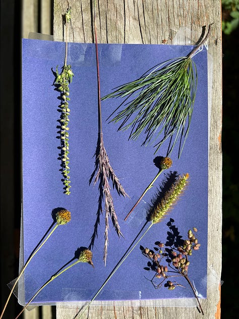 Susan Simard, author of Finding the Mother Tree, invited me to listen to forrest again. Not just the creak of their trunks or colliding branches, but to their stories of growth and balance and survival. I spent many hours listening and watching and being with the pines on the native lands of the Ho-Chunk and Menominee peoples. I swam with creek trout, read sci-fi and indigenous history, foraged and sun printed grass bouquets, and visited ancient petroglyphs in Roche a Cri State Park. I welcomed the monarchs and heard migrating birds before they, like me, returned south.